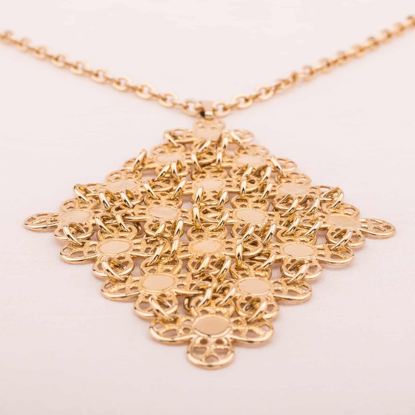 Great vintage necklace by SARAH COVENTRY from the 1972 collection. The model name was: "Golden Petals". This necklace is a real boho-hippie jewelry! The diamond-shaped pendant is made of metal flowers like a net and moves with you. Also check out the matching earrings that made fashion history.
