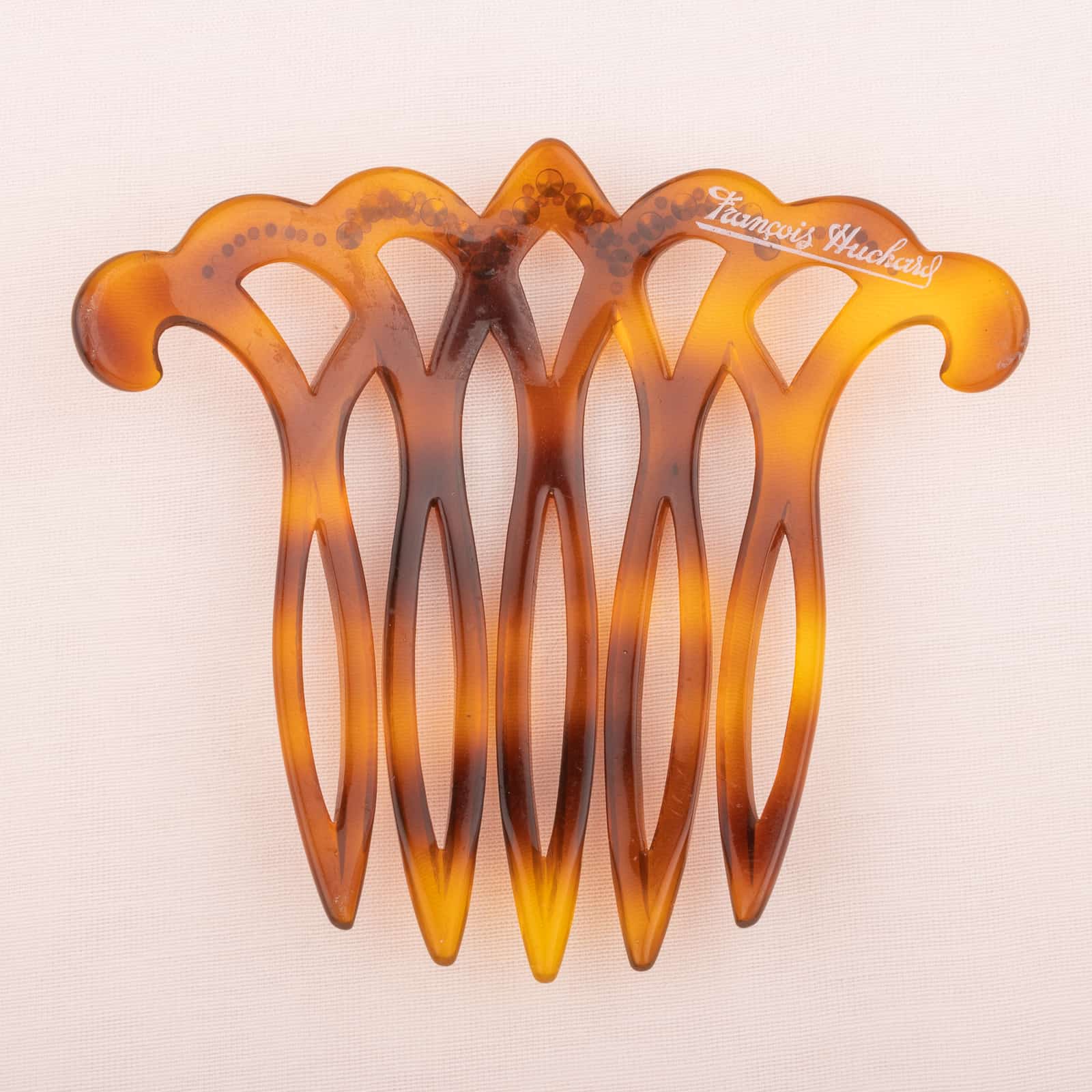 Schöner Vintage Steckkamm aus Frankreich von FRANCOIS HUCHARD. Der geschwungene Kamm ist in Hornoptik gefertigt mit Strass Steinen verziert. Vintage Haarschmuck verleiht deinem Haar Style einen individuellen Retro Look.